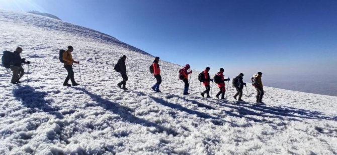 Burada hazırlıklarını tamamlayan dağcılar, 4 gün olarak planladıkları zirve tırmanışına Sabah saat 06:05’te Ağrı Dağı’nın zirvesine ulaşmayı başaran dağcılar, zirvede havanın sıcak olmasını fırsat bilerek yaklaşık 2 saat boyunca zirvede çay içip, kahvaltı yaptı.