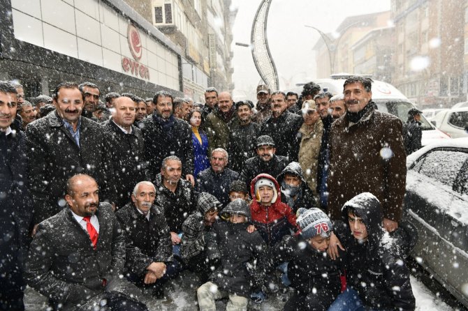 Kar yağışı altında vatandaşlarla beraber hatıra fotoğrafı çeken Bakan Soylu ve beraberindekiler kent merkezinden ayrılarak karayolu ile Van’a harekat etti.