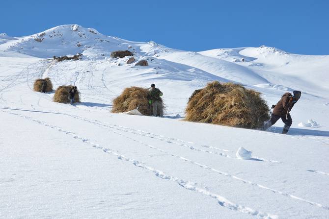 Karın yağmasıyla 2 bin rakımlı dağlarda biriktirdikleri ot yığınlarını almak için harekete geçen köylüler, kürek ve naylon brandalarını omuzlarına alarak yola koyuluyorlar. Kar kalınlığının yer yer 3 metreyi aştığı bölgede ilerleyen köylüler, hayvanlarını beslemek için dondurucu soğuklara aldırış etmiyor.