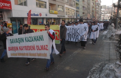 Altay Caddesi üzerinde bulunan Hakkari Meslek Yüksekokulu önünde bir araya gelen öğrenci grubu buradan ellerindeki siyah bez ve üzerlerinde kefeni temsil eden beyaz giysilerle ve ellerinde bulunan hayatını kaybedenlerin fotoğrafları ile