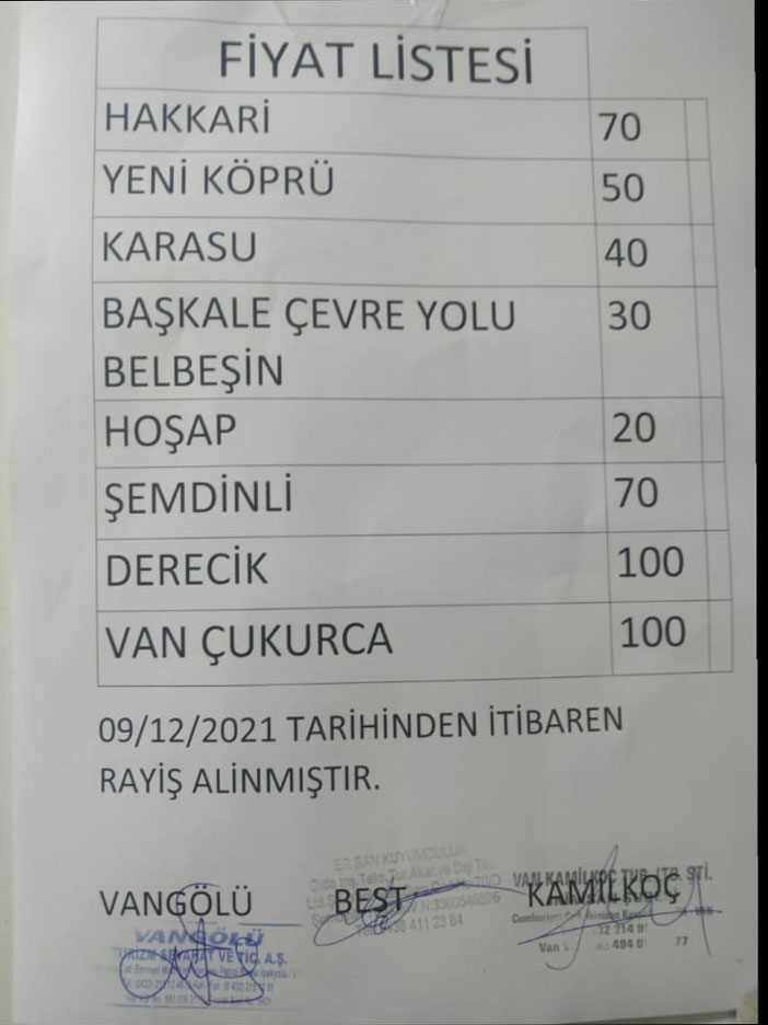 Hakkari - Van güzergahında yolcu taşımacılığı yapan 3 firmanın aldığı ortak karar ile Hakkari - Van arasında 50 TL olan yolcu ücreti 70 TL'ye çıkartıldı.