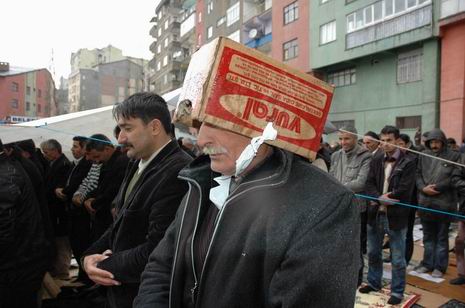 Bulvar Caddesi üzerinde bulunan “Demokratik Çözüm Çadırı” önünde toplanan kalabalığın bir kısmı çadırda bir kısmı ise partililer tarafından üstü naylonla örtülen alanda diğer kısmı ise yer bulamayanca şiddetli yağmura rağmen çadırın önüne serdikleri karton ve afişlerin üzerinde Cuma namazlarını kıldılar. Şiddetli yağmura rağmen namaz kılmayı sürdüren vatandaşlar ilginç görüntüler sergilediler. Kimisi yağmurdan korunmak için başına poşi bağlarken kimisi ise karton parçası, naylon ve şemsiye ile yağmurdan korunmak suretiyle namazını kıldı. Alanda yer bulamayan kadınlar ise parti binasında namazlarını kıldılar.
