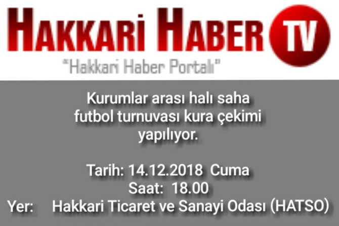 Hakkarihabertv.com öncülüğünde başlatılan ve yaklaşık 20 kurum takımının başvurduğu kurumlar arası halı saha turnuvası kura çekimi 14.12.2018 saat: 18: 00'da Hakkari Ticaret ve Sanayi Odası konferans salonunda yapılacak.