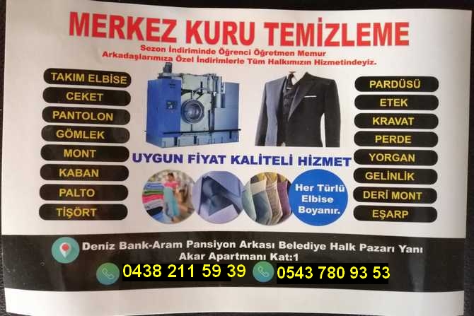 Kıymetli giyişlerinizin tek adresi olan Merkez Kuru Temizleme, boyama işleri, ütü işleri, takım elbise, gömlek, ceket, kaban, palto ve pardesü yıkama işleri itina ile yapılıyor.