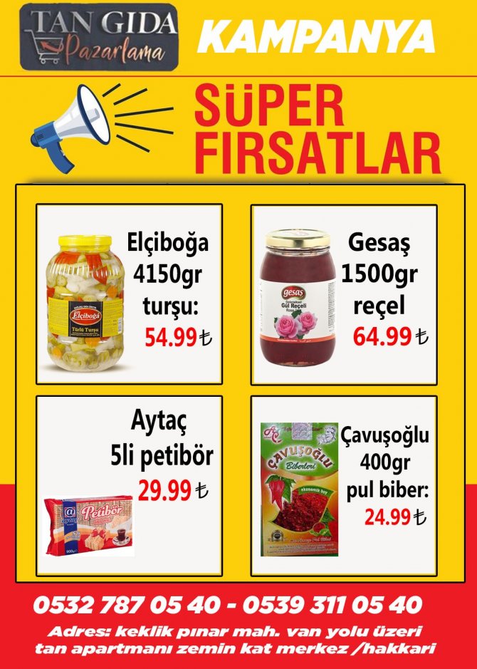 24 saat müşteri servis aracı ile hizmetinizde olan işyeri bir telefonla siparişleri anında kapınıza ulaştıran Tan Gıda & Pazarlama Toptan Gıda Mamulleri adlı işyeri Haziran ayında her kesimi sevindirecek indirim kampanyası başlattı.