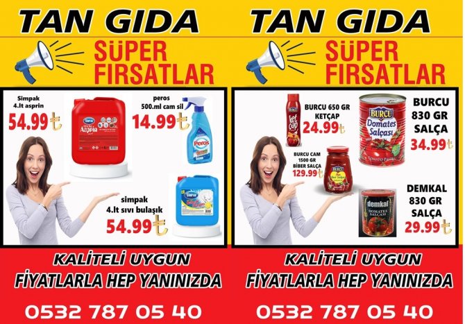 24 saat müşteri servis aracı ile hizmetinizde olan işyeri bir telefonla siparişleri anında kapınıza ulaştıran Tan Gıda & Pazarlama Toptan Gıda Mamulleri adlı işyeri Kasım ayında her kesimi sevindirecek indirim kampanyası başlattı.