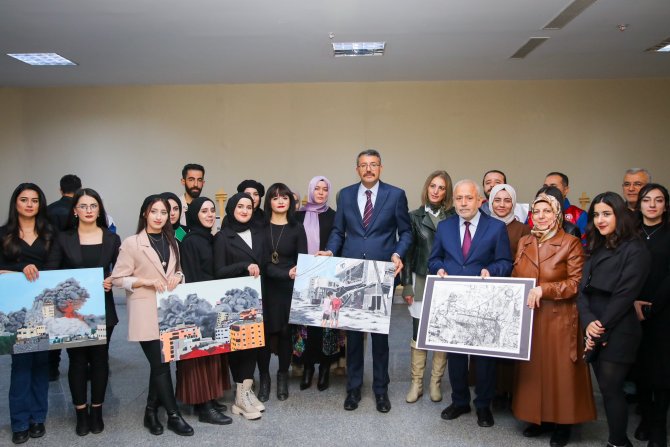 Eğitim Fakültesi’nin resim-iş bölümü tarafından hazırlanan Filistin Temalı Resim Sergisi’ni inceleyen Vali Çelik, sergide emeği geçen herkese teşekkürlerini iletti.