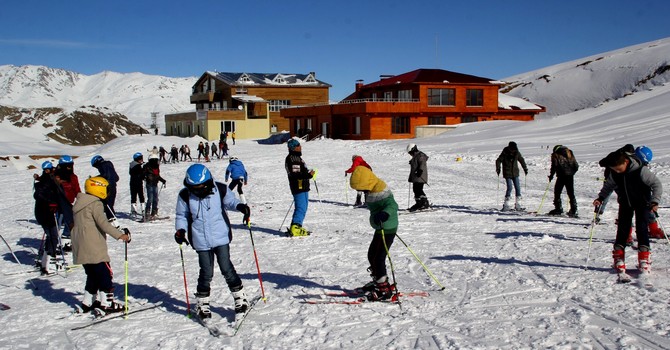 Kent merkezinden 7 kilometre mesafede bulunan 2 bin 800 rakımlı Merga Bütan kayak tesislerinde kayak antrenörleri Sabri Demir, Ramazan Sevinç, Halil Kurşun ve Erman Çetin tarafından öğrencilere kayak ve kayma teknikleri eğitimi verildi.