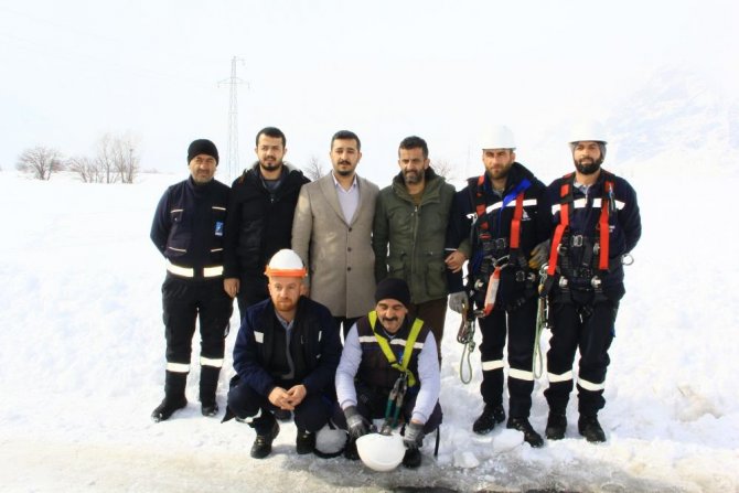 Kar kalınlığının 2 metreyi bulduğu bölgede giydikleri hediklerle kara bata çıka ilerleyen VEDAŞ ekipleri, zor şartlar altında çalışmalarını yürüterek arızayı tespit etti.