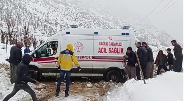 Köy halkı ambulansı mahsur kaldığı yerden kurtarmak için seferber oldu. Uzun çalışma sonucu ambulans mahsur kaldığı yerden kurtarıldı.