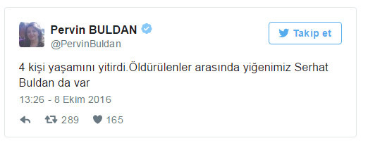Yüksekova'daki olayda hayatını kaybedenlerden Serhat Buldan'ın, HDP Milletvekili Pervin Buldan'ın yeğeni olduğu ortaya çıktı. Buldan, Twitter'dan yaptığı açıklamada öldürülenler arasında yeğeninin de olduğunu duyurdu.